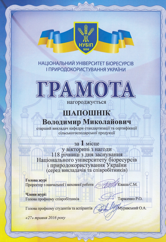 Старший викладач кафедри стандартизації та сертифікації сільськогосподарської продукції факультету харчових технологій та управління якістю продукції АПК к.вет. наук Володимир Шапошнік виборов перше місце у вікторині.