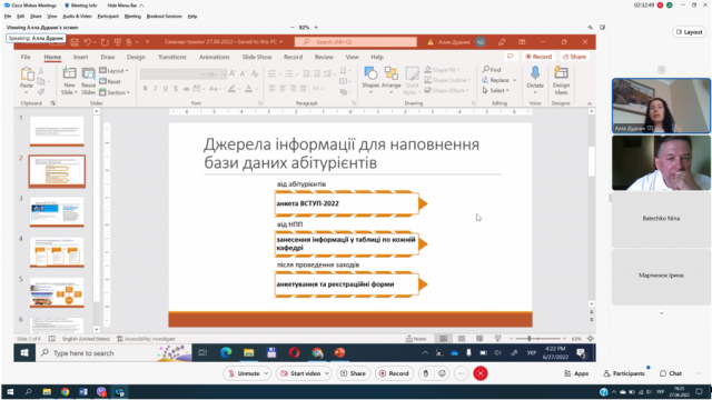 Особливу увагу учасників Алла Олексіївна звернула на порядок наповнення бази даних вступників та коректності введених даних, розкрила форми звітів та моніторингу статусу вступників під час вступної кампанії.