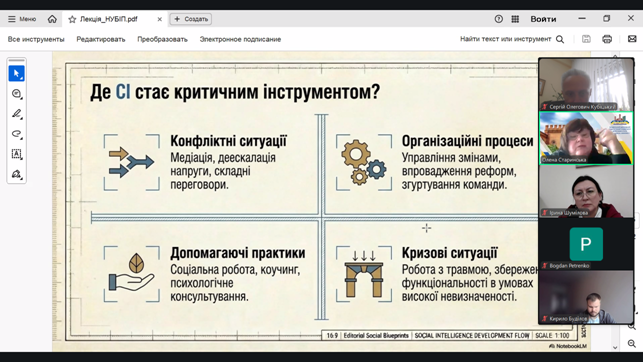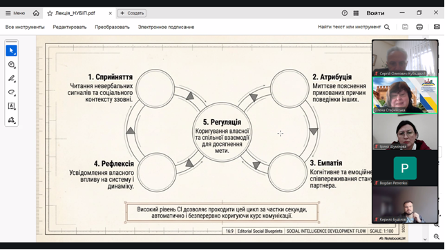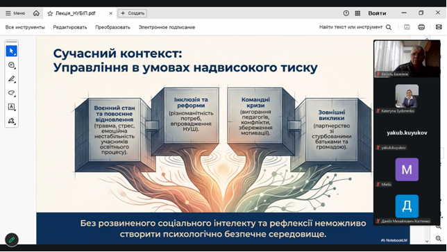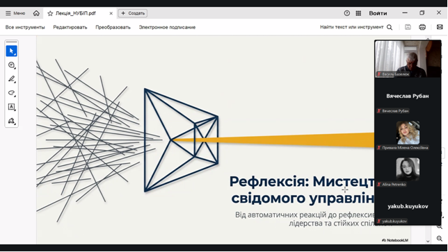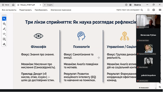 Лекція мала чітко виражений науково-практичний характер. У межах викладу було поєднано теоретико-методологічні положення сучасної психології управління, концепції соціального інтелекту та підходи до розвитку рефлексивної компетентності керівника з практичними кейсами функціонування освітніх організацій. Такий підхід забезпечив високий рівень прикладної цінності матеріалу та його адаптацію до професійних запитів майбутніх управлінців.