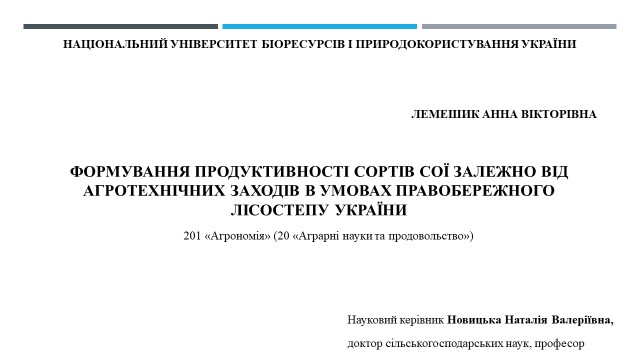 4 травня 2024 року на засіданні кафедри рослинництві відбувся попередній захист захист дисертаційних робіт Лемешик Анни Вікторівни на тему «Формування продуктивності сортів сої залежно від агротехнічних заходів в умовах Правобережного Лісостепу» (науковий керівник – професор Новицька Н.В.) та Аврамчука Віталія Івановича на тему «Продуктивність соняшнику за внесення добрив та ретардантів в умовах Правобережного Лісостепу України» (науковий керівник – доцент Гарбар Л. А.).