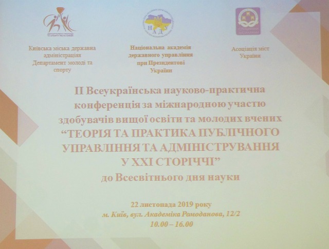 Аспіранти Національного університету біоресурсів і природокористування України за спеціальністю 281 «Публічне управління та адміністрування» разом з бакалаврами за цією ж спеціальністю стали учасниками ІІ Всеукраїнської науково-практичної конференції за міжнародною участю здобувачів вищої освіти та молодих учених «Теорія та практика публічного управління та адміністрування у ХХІ сторіччі», яка відбулася 22 листопада 2019 року у Національній академії державного управління при Президентові України.