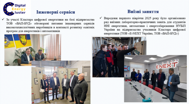 Окрему обговорили питання надання освітніх послуг з підвищення кваліфікації, які було проведено за підтримки Кластера для фахівців ПрАТ ДТЕК «Київські регіональні електромережі», ПрАТ ДТЕК «Київські електромережі», ТОВ «Атмосфера». Ще одним вагомим досягненням стало впровадження освітньої послуги з мікрокваліфікацій для ветеранів війни. Її реалізацію забезпечили ННІ енергетики, автоматики і енергозбереження спільно з ТОВ «Атмосфера» в межах ініціатив Reskilling Ukraine та програми UNIT 6.0.