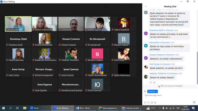 З метою ознайомлення здобувачів вищої освіти з особливостями формування єдиної команди, працюючи з різних куточків світу, 22 березня 2023 року доцентом кафедри менеджменту ім. проф. Й. С. Завадського Наталею Драгнєвою в межах діяльності студентського наукового гуртка «ДНК Лідера» була організована зустріч (на онлайн-платформі Zoom) Оленою Миколаївною Солохою.
