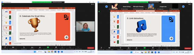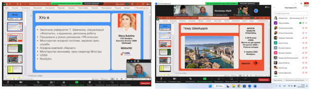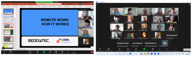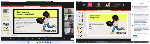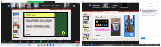 Олена Миколаївна розповіла гуртківцям та іншим присутнім про історію розвитку IT-компанії «Reddytec», про те що команда компанії працює у 8 країнах (Швейцарія, Україна, Німеччина, Іспанія, Польща, Литва, Португалія, Словаччина) та розмовляє 6 різними мовами. Зазначила, що власник і половина команди – українці, а робоча мова – англійська. Звернула увагу на те, які чинники сприяють формуванню їх команди, а саме: спільна мета і місія; корпоративна айдентика (брендбук, мерч); корпоративний сайт, соціальні мережі; спільні клієнти і завдання; постійна комунікація; спільний відпочинок і святкування важливих дат разом.