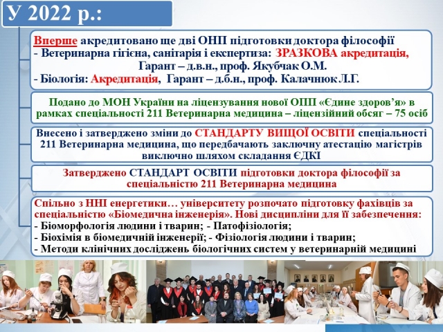Затверджено стандарт освіти підготовки доктора філософії за спеціальністю 211 Ветеринарна медицина. Вперше акредитовано дві ОНП підготовки доктора філософії: «Ветеринарна гігієна, санітарія і експертиза» (зразкова), гарант проф. Якубчак О.М. і «Біологія», гарант проф. Калачнюк Л.М.