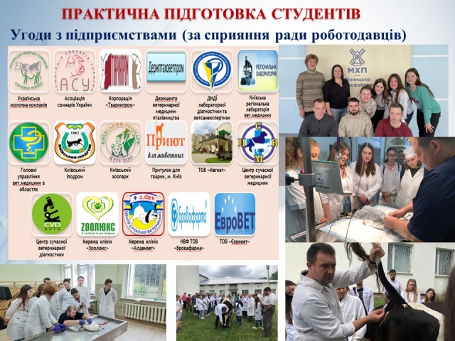 Ведеться активна співпраця з радою роботодавців. З метою підвищення якості клінічної підготовки здобувачів вищої освіти і наукових досліджень укладені угоди про стратегічне партнерство та науково-технічне співробітництво факультету з державними і приватними клініками ветеринарної медицини, Українською молочною компанією, Центром сучасної медицини, «Зоолюкс», «Алден-Вет», «Друг», ТОВ «Магнат», ДНДІ лабораторної діагностики та ветсанекспертизи, регіональними лабораторіями ветеринарної медицини, Інститутом медицини НААН, ННЦ «Інститут експериментальної і клінічної ветеринарної медицини НААН», фірмою «Роял Канін Україна», Центром сучасної діагностики НВО Біотестлабораторія та ін.