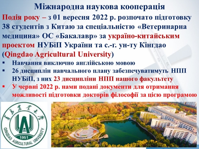З 1 вересня 2022 р. розпочато підготовку 38 студентів з Китаю за спеціальністю «Ветеринарна медицина» ОС «Бакалавр» за україно – китайським проєктом НУБіП України та с.-г. ун-ту Кінгдао (Qingdao Agricultural University).