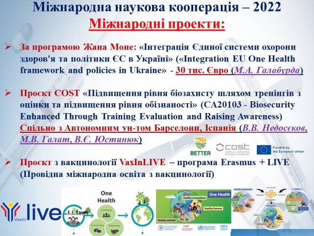 Виконувався проєкт за програмою Жана – Моне « Інтеграція Єдиної системи здоров’я та політики ЄС в Україні» (« Integration EU One Health framework and policies in Ukraine»).