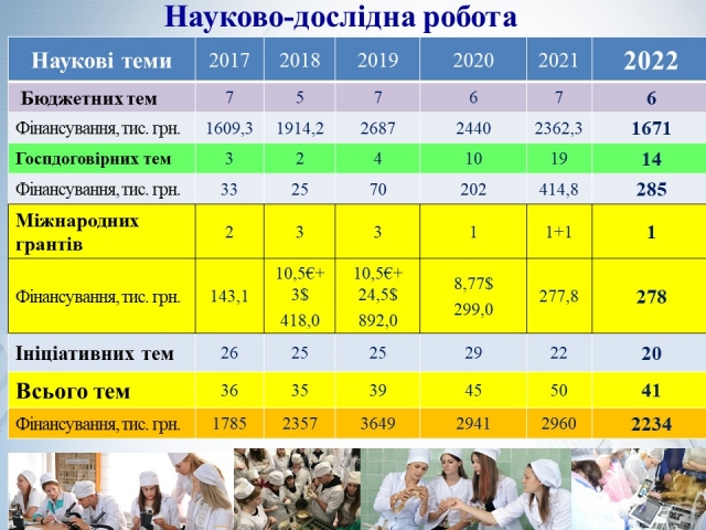 У нинішньому році на факультеті виконувалась 41 наукова тема, у т.ч. 6 бюджетних, 14 госпдоговірних і 1 за міжнародним грантом на загальну суму 2234 тис. грн.
