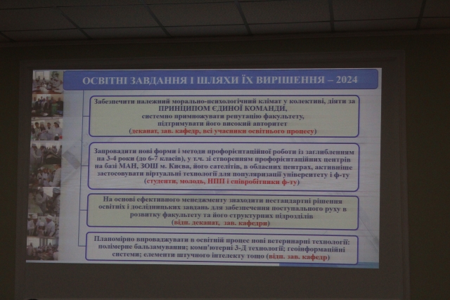 Серед багатьох завдань 2024 року одними із основних є активна перебудова освітнього і наукового процесів відповідно до вимог воєнного стану, органічно поєднувати класичні та віртуальні технології ведення занять, забезпечити наявність міжнародних освітніх програм з отримання подвійних дипломів, здійснювати пошук нових шляхів для постійного покращення матеріально-технічної бази кафедр шляхом придбання лабораторного і клінічного обладнання та приладів, реконструкція стаціонарів та створення кафедр з відповідними клініками за видами тварин, заключення міжнародних грантових досліджень, проходження міжнародної передакредитаційної експертизи та інші.