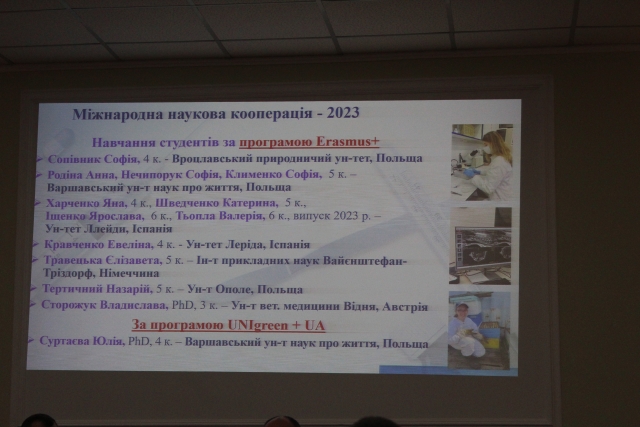 Науково-педагогічні працівники, аспіранти та здобувачі вищої освіти впродовж року брали участь у багатьох Міжнародних заходах за кордоном, а саме: за програмою ERASMUS + у Вроцлавському природничому університеті, Польща, університеті Ллейда, Іспанія, університеті Леріда, Іспанія, Інституті прикладних наук Вайєнтефан Тріздорф, Німеччина, Університеті Ополе, Польща, Університеті ветеринарної медицини Відня, Австрія; за проектом INTERACT (NAWA) у Вроцлавському природничому університеті, Польща; за програмою UNIgreen+UA у Варшавському університеті наук про життя, Польща; за програмою Вернера Балтеса в Інституті оцінки ризиків, Німеччина.