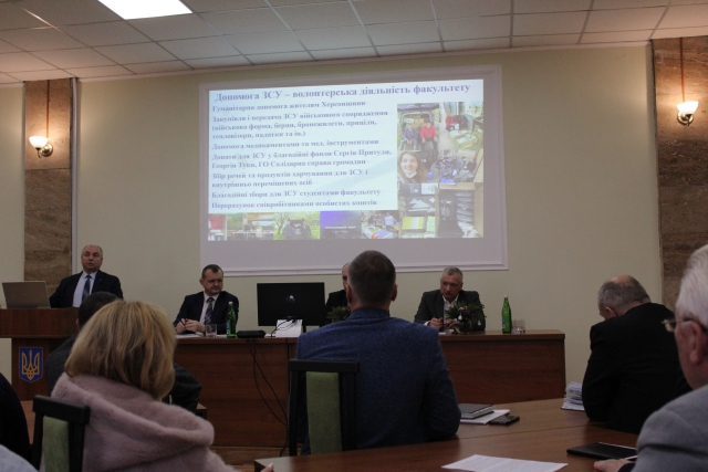 У звітній доповіді декан факультету Микола Цвіліховський відзначив, що незважаючи на воєнний стан і глобальні виклики, факультет продовжив динамічний розвиток, реалізуючи стратегічну мету і завдання, визначені Законом України «Про вищу освіту», закріплені в Статуті та програмі розвитку університету «Голосіївська ініціатива 2025».