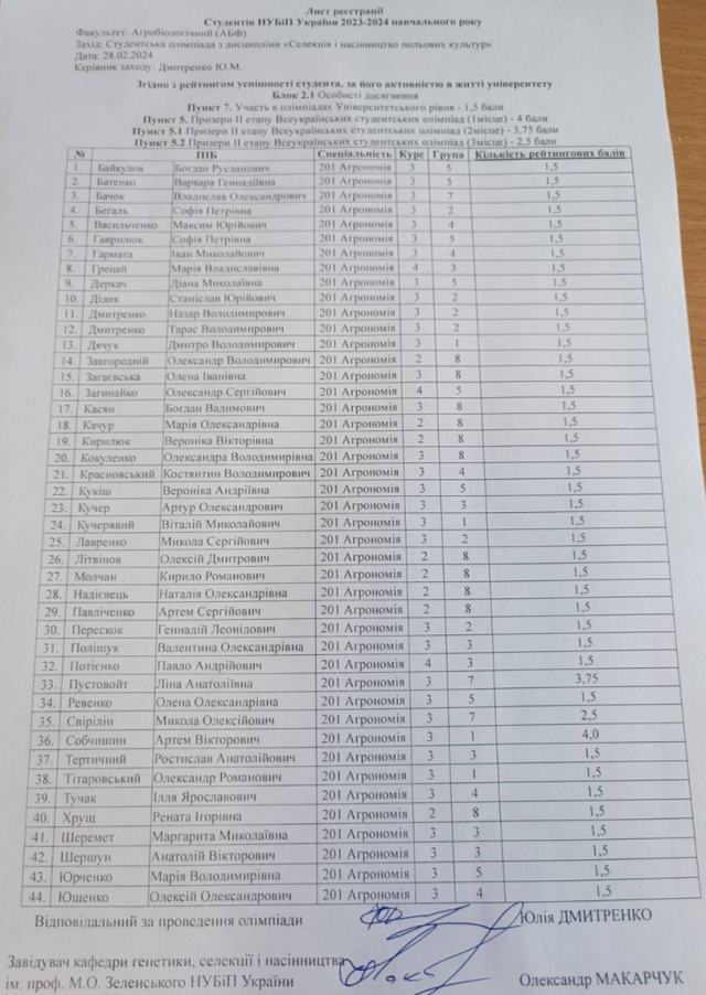На кафедрі генетики, селекції і насінництва ім. проф. М.О. Зеленського 28 лютого у дистанційній формі на платформі «Оlympus» було проведено студентську олімпіаду з дисципліни «Селекція і насінництво польових культур». У заході взяли участь бакалаври першого, другого, третього, четвертого курсів і магістри першого року навчання агробіологічного факультету (всього 44 особи).