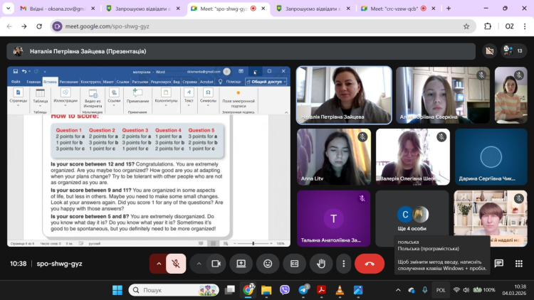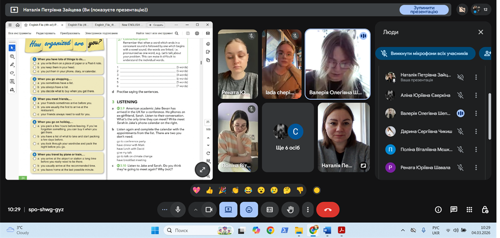 4 березня 2026 року відбулося відкрите практичне заняття доцента кафедри англійської філології Зайцевої Наталії Петрівни з дисципліни «Іноземна мова (англійська)» для студентів 1-го курсу спеціальності «Психологія» гуманітарно-педагогічного факультету.