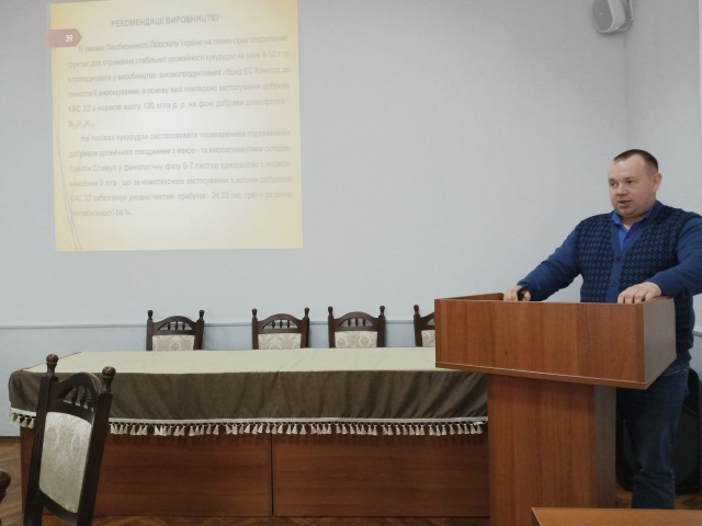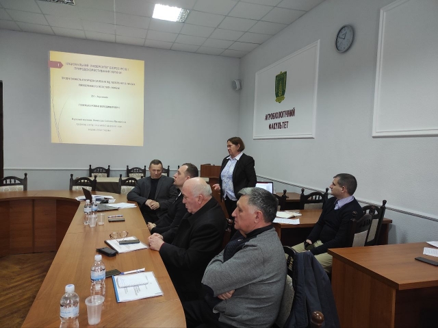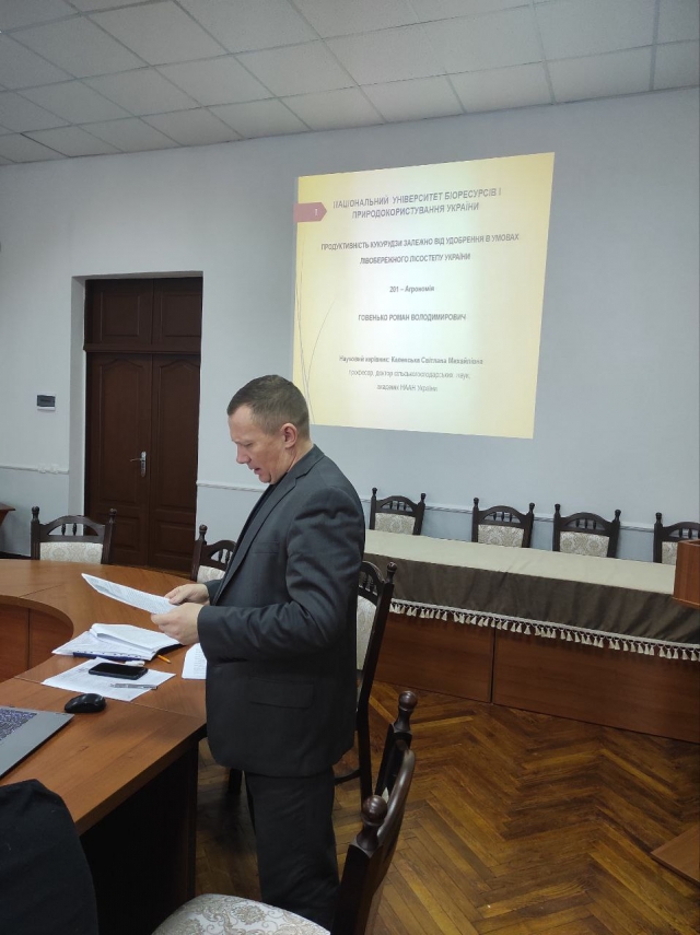 Роман Говенько представив доповідь за темою дисертаційного дослідження «Продуктивність кукурудзи залежно від удобрення в умовах Лівобережного Лісостепу України». Рецензентами виступили Дмитро Літвінов, д. с.-г.н., професор кафедри землеробства та гербології, та Наталія Новицька, д. с.-г.н., професор кафедри рослинництва. Вони відмітили, що в дисертаційній роботі Роману вдалося взаємопов'язати науку та виробництво.