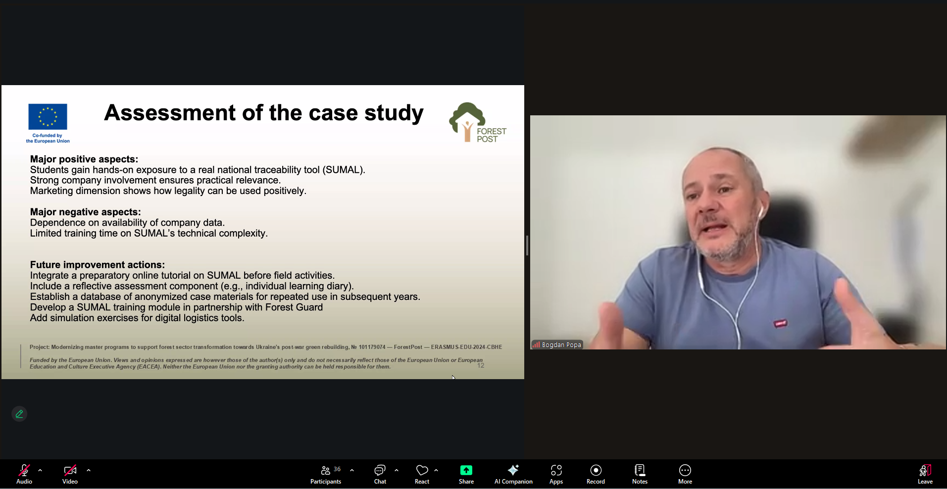 проф. Богдан Попа (Transilvania University of Brașov, Румунія), який представив тематичні дослідження «SUMAL and Company Traceability Systems in Romania» –приклад впровадження дуальної освіти через практичне вивчення системи електронного обліку деревини SUMAL 2.0
