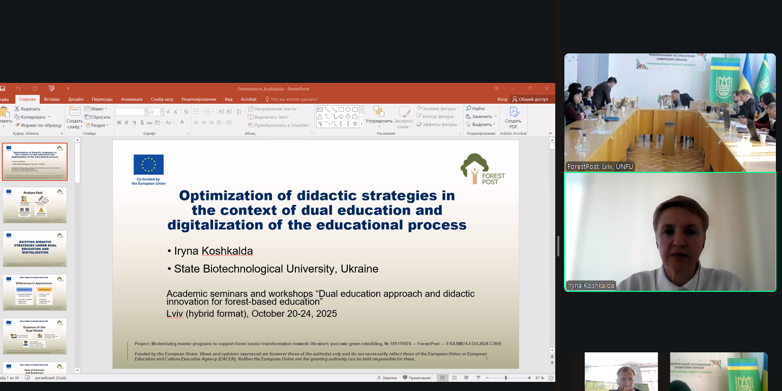 Професор Ігор Соловій також привітав учасників та детально представив основні ідеї, мету та завдання міжнародного проєкту ForestPost. Разом із докторкою Галиною Лесюк з Національного лісотехнічного університету України він презентував результати дослідження «Dual education opportunities for the forest sector in Ukraine: Findings of the survey», у якому представлено аналітику щодо стану та перспектив розвитку дуальної освіти в Україні, зокрема в лісовому секторі. Вони також підкреслили важливу роль НУБіП у розробленні нормативно-правової бази дуальної освіти та зазначили, що саме університетські фахівці брали участь у підготовці Концепції підготовки фахівців у дуальній формі освіти, затвердженої Кабінетом Міністрів України у 2018 році.