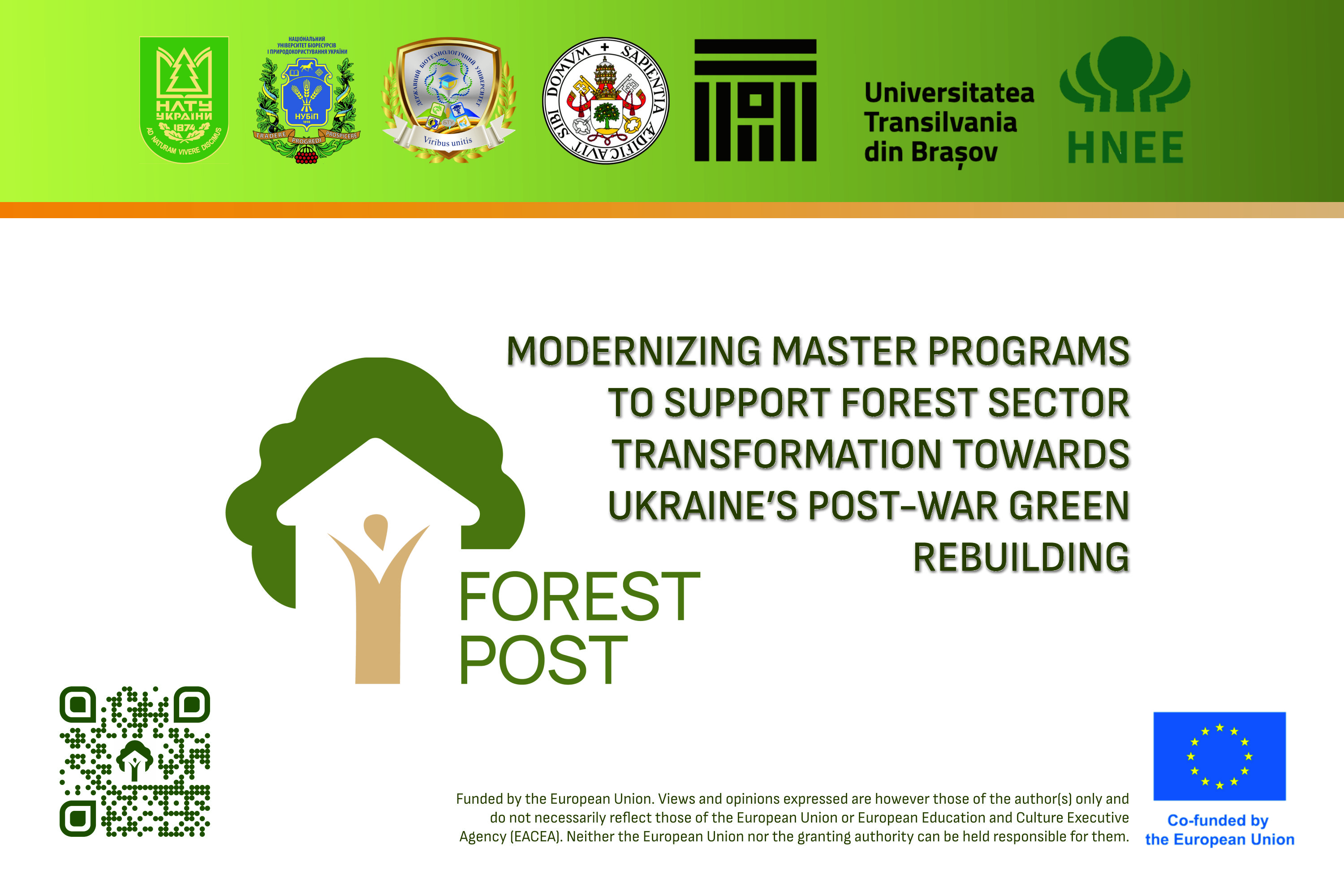 ForestPost (Modernizing master programs to support forest sector transformation towards Ukraine’s post-war green rebuilding) – це трирічний міжнародний проєкт програми Erasmus+ (CBHE), спрямований на модернізацію магістерських освітніх програм у галузі лісового господарства та підвищення їхньої відповідності сучасним потребам ринку праці й викликам «зеленої» післявоєнної відбудови України. Координатором проєкту є Національний лісотехнічний університет України, а серед партнерів – НУБіП України, Державний біотехнологічний університет, Університет Вальядоліда (Іспанія), Трансільванський університет Брашова (Румунія) таУніверситет сталого розвитку Еберсвальде (Німеччина). Проєкт об’єднав 6 університетів і 33 асоційованих партнери з державного, приватного та громадського секторів. Проєкт фінансується за програмою Erasmus+ Capacity Building in Higher Education (Strand 2). Одне з ключових завдань проєкту – розробити 12 нових навчальних курсів на основі дуальної освіти, які сприятимуть формуванню у студентів зелених навичок, цифрової грамотності та практичного досвіду.
