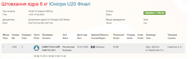 Ростислав Шмигельський, студент групи ЕЕЕ-22001б нашого інституту, взяв участь у змаганні – Кубок України з легкої атлетики з штовхання ядра масою 6 кг серед юніорів U20, яке відбулося 14 жовтня 2023 року під егідою Федерації легкої атлетики України.