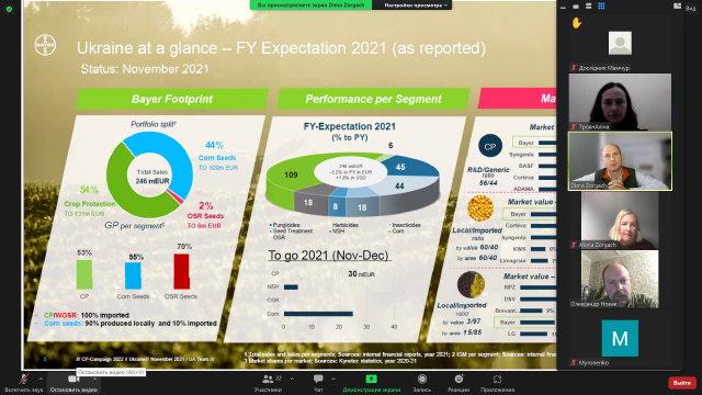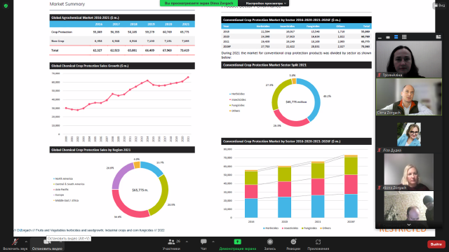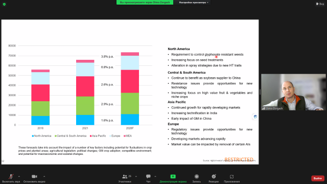 У ході зустрічі детально було розглянуто особливості ринку засобів захисту рослин та насіння у світі, Європі та Україні. Дмитро Зоргач проаналізував частки ринку в розрізі типів ЗЗР (гербіцидів, фунгіцидів та інсектициди) за регіонами, провідними країнами, за сільськогосподарськими культурами.