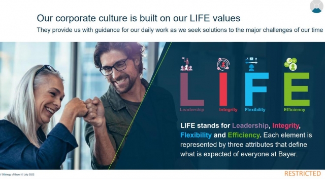 Спікер зазначив, що Bayer дотримується принципів сталого розвитку та є соціально відповідальною компанією. Корпоративна культура компанії опирається на LIFE цінності (L (Leadership) - лідерство, I (Integrity) - інтегрованість, F (Flexibility) - гнучкість, E (Efficiency) - ефективності).