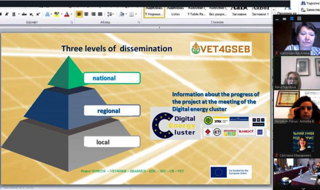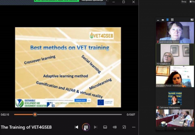 Після детального аналізу найкращих навчальних практик було вирішено, що доцільно прийняти гнучкий, гібридний метод навчання в рамках проєкту VET4GSEB, з використанням платформи електронного навчання шляхом застосування цифрових технологій у супроводі відео матеріалів, скрінкастів, інтерактивних презентації та вікторини.