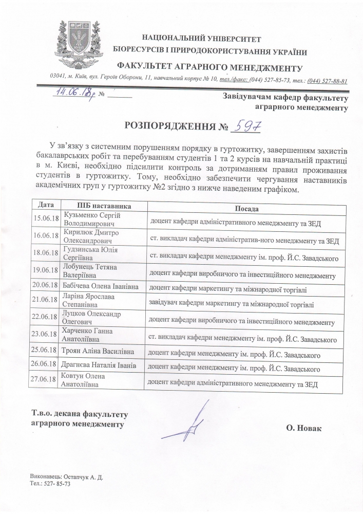 Для підсилення контролю за дотриманням правил проживання на період до кінця червня було складено графік чергувань наставниками груп, студенти яких згідно графіку навчального процесу на даний момент перебувають у м. Києві та проживають в гуртожитку.