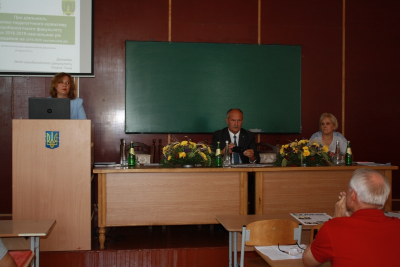 Порядок денний засідання розпочався із доповіді декана факультету Оксани Тонхи про підсумки діяльності науково-педагогічного колективу за 2018-2019 н.р. та завдання на новий навчальний рік. У своєму виступі декан окреслила головні досягнення колективу факультету у навчальній, науковій та інноваційній діяльності. Детально проаналізувала структурну організацію факультету, кадровий склад науково-педагогічних працівників. За словами доповідача агробіологічний факультет НУБіП України є одним із провідних факультетів університету і серед агрономічних факультетів аграрних вузів України.