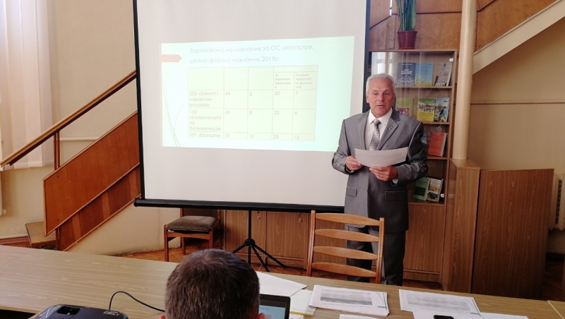 29.08.2019р. об 11.00 год. в читальній залі 4 начального корпусу відбулося розширене засідання вченої ради факультету захисту рослин, біотехнологій та екології. Про підсумки діяльності науково-педагогічного колективу факультету в 2018-2019 навчальному році та завдання на наступний навчальний рік. З доповіддю виступив голова вченої ради, декан факультету д.с.-г.н., професор, член-кореспондент НААН Доля М.М., в якій особливу увагу приділив питанням вступної кампанії, посиленні профорієнтаційної роботи науково-педагогічними працівниками факультету, підготовці кадрів бакалаврат-магістратура-аспірантура-докторантура, науково-дослідній роботі та публікаціям в науково-метричних базах, створенню і оснащенню лабораторій кафедр, а також виробничому навчанню фахівців.