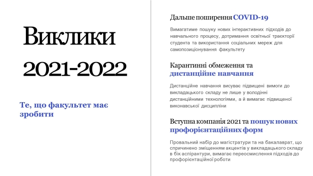 Але враховуючи виклики сьогодення – дальше поширення COVID-19 та зменшення контингенту студентів у 2021-2022 н.р. і на бакалавраті, і в магістратурі засвідчили про необхідність переглянути ставлення колективу до своїх функціональних обов’язків, змістивши акценти своєї діяльності на ті напрями, що потребують першочергового здійснення. Зокрема, пошук абітурієнта 2022 та наповнення спецфонду за результатами наукової роботи.