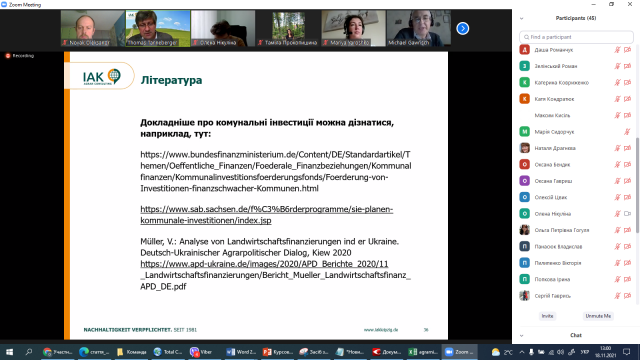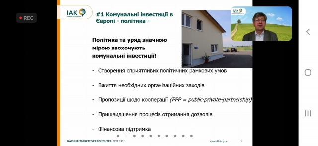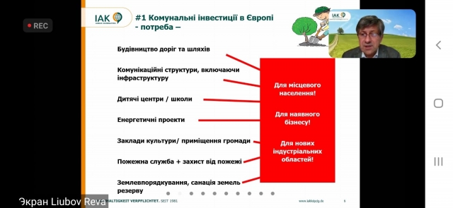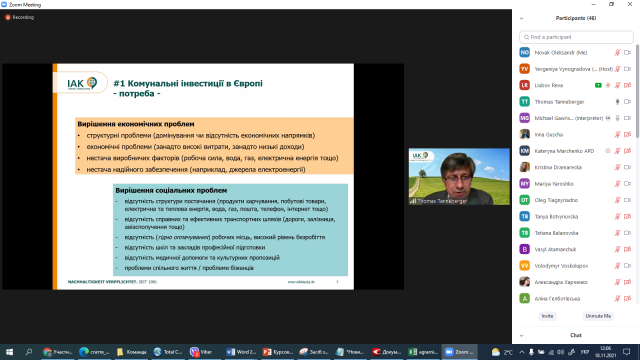 У сучасних умовах висвітлена тематика є надзвичайно актуальною, оскільки, дозволяє виявити суть, особливості та значення комунальних інвестицій для України та вивчити досвід країн Європи з цього питання. Так, особливу увагу Томас Таннебергер приділив одному із напрямів підтримки ELER (Європейський сільськогосподарський фонд розвитку сільських територій) від ЄС проекту LEADER (Liaison entre actions de développement de l'économie rurale – зв’язок між діями щодо розвитку сільської економіки). Спікер зазначив, що по всій Європі близько 2800 груп LEADER керують кількома 10 000 проектами на благо економічного, культурного, соціального та екологічного розвитку в сільській місцевості. Також, доповідач досить детально представив пропозиції комунальних інвестицій, які існують для громад в Україні, серед них: знаходити і використовувати свободу дій, щоб заробити більше грошей на сільський розвиток; підтримувати основне медичне забезпечення, сільську інфраструктуру, школи та навчання дорослих у сільській місцевості; просувати бізнес та стимулювати інвестиції та інші.