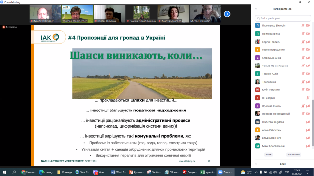 Під час зустрічі Томас Таннебергер представив інформацію про розвиток сільської економіки та послуг загального інтересу – німецький досвід та ідеї для України. В межах запропонованих тем спікер розповів про комунальні інвестиції в Європі, фінансування комунальних інвестицій (Німеччина), що таке і що дає програма LEADER? (обсяг та спосіб функціонування, результати та тематичні приклади, пропозиції для громад в Україні).