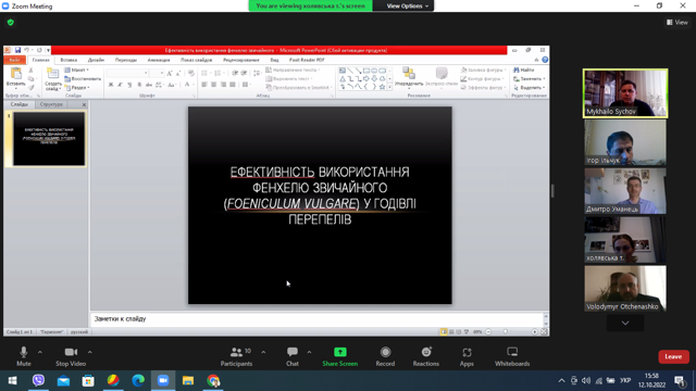Оскільки вибір теми дисертаційного дослідження є найвідповідальнішим етапом у науково-дослідницькій роботі кожного аспіранта, Тетяна з науковим керівником – Уманцем Дмитром Петровичем, представила доповідь та презентацію, у якій продемонструвала аналіз останніх досліджень у галузі птахівництва та аргументувала шляхи вирішення поставлених наукових проблем.