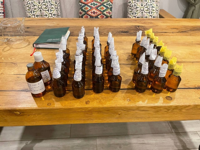 Зображено зразки біоактивної води (рідина) з різних періодів медозбору.