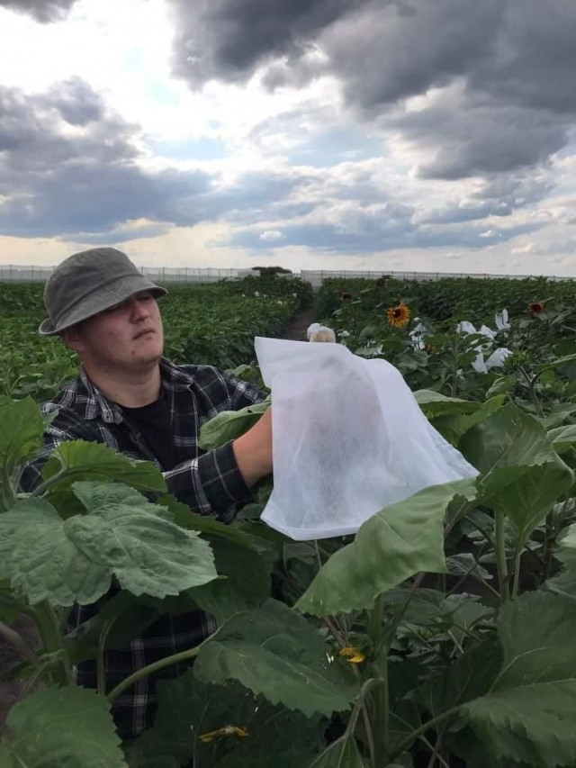 Олексій Гаркуша: "Так як соняшник це перехреснозапильна культура доводиться встигати проводити ранкові кастрації квіток, ізолювати окремі суцвіття та підбирати пари для схрещувань. Роботи багато, а час виробничої практики вже закінчується. Результати невдовзі продемонструю в звіті."