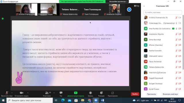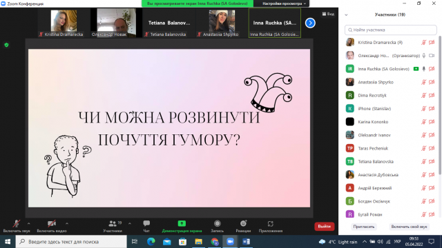 Ручка Інна розкрила суть теми: «Позитивне ставлення до життя і людей. Почуття гумору та його розвиток».Студентка 4 курсу, 2 курсу факультету аграрного менеджмент зазначила, що гумор – це вираження доброзичливого і жартівливого ставлення до подій, ситуацій, поведінки інших людей і до себе, що ґрунтується на здатності сприймати, виділяти і розуміти смішне. Інна, зазначила, почуття гумору можна розвинути.