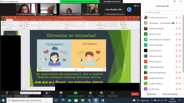 Керівник наукового гуртка «ДНК Лідера» доцент кафедри менеджменту ім. проф. Й. С. Завадського Олександр Володимирович Новак продемонстрував презентацію на тему: «Позитивне ставлення до життя і людей». Де спробував відповісти на питання: Оптимізм чи песимізм? Та навів 5 аргументів на користь оптимізму: