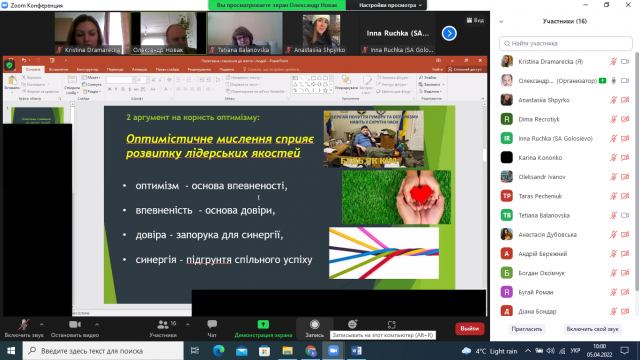 В межах діяльності студентського наукового гуртка «ДНК Лідера» 5 березня 2022 року був організований семінар «Особисті аспекти лідерства» в онлайн режимі. До цієї зустрічі долучилось понад 30 здобувачів вищої освіти різних курсів і факультетів НУБіП України. Об’єднувало їх прагнення висловити і почути думки на важливі для них теми в сучасних умовах.