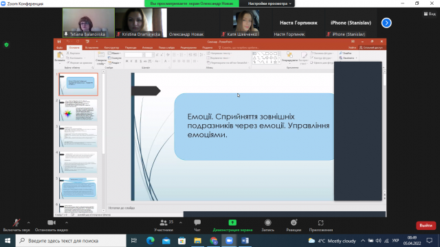 Студентка 4 курсу, 2 курсу факультету аграрного менеджмент Анастасія Горпиняк дослідила та розкрила тему: «Емоції. Сприйняття зовнішніх подразників через емоції. Управління емоціями». Дівчина представила трактування поняття «емоції», класифікацію емоцій та типологію емоційної компетентності. Учасники семінару зазначили, що розглянута тема є для них актуальною, оскільки розкриває принципи управляння емоціями, які можна застосувати в сьогоднішніх умовах війни.