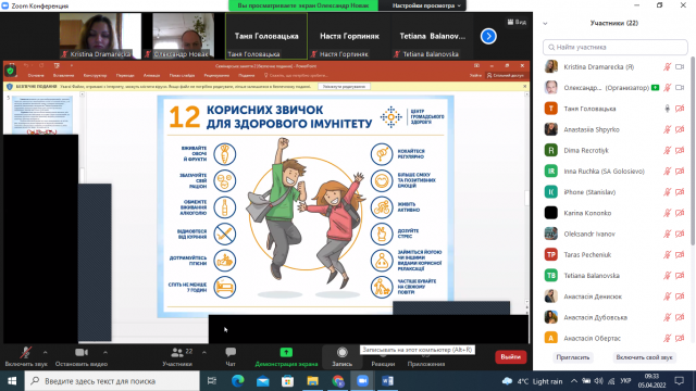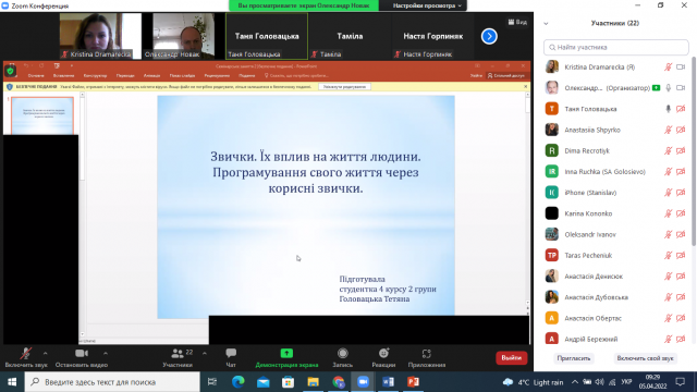 Головацька Тетяна обрала тему для дослідження: «Звички. Їх вплив на життя людини. Програмування свого життя через корисні звички». Студентка 4 курсу, 2 курсу факультету аграрного менеджмент в своїй доповіді зазначила, що шкідливі звички є у кожної людини та уточнила, які з них відносно безпечні для здоров’я і життя, а які – прямий шлях жити неповноцінно. В демонстрації Тетяна навела 12 корисних звичок для здорового імунітету та вказала, що не потрібно впадати в депресія, якщо не виходить впровадити звичку, необхідно спробувати зменшити навантаження, змінити графік і почати знову.