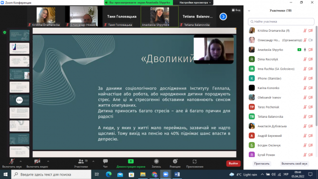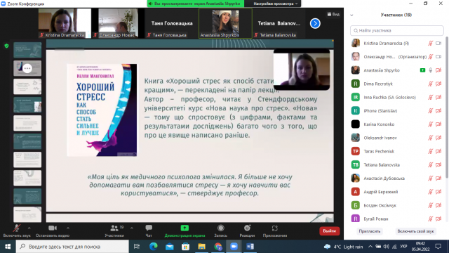 Студентка 4 курсу, 3 курсу факультету аграрного менеджмент Анастасія Шпирко представила презентацію, де навела основні аспекти теми: «Хороший стрес як спосіб стати сильнішим і кращим». В своїй доповіді студентка представила 7 порад з книги за матеріалами книги Келлі Макгонігал «Хороший стрес як спосіб стати сильнішим та кращим». Анастасія, зазначила, що автор вказує, що протягом усього життя люди переживають безліч стресів. Вони пов'язані з дорослішанням, старінням, навчанням і роботою, сім'єю і здоров'ям, фінансами і спілкуванням. Люди звикли сприймати стреси, як щось погане, але насправді хороший струс – потужне джерело енергії і універсальний засіб для загартування характеру, це секретний механізм адаптації до найважчих умов.