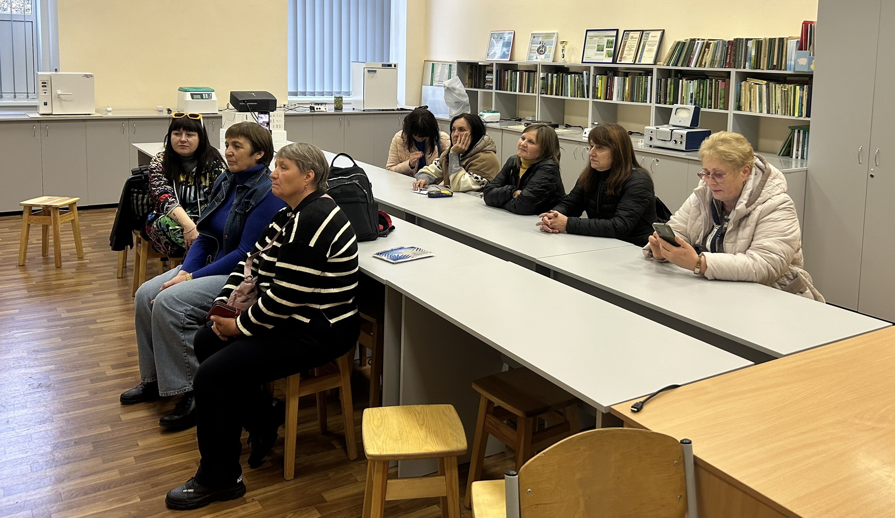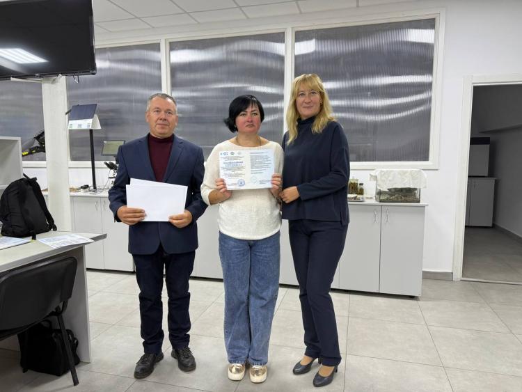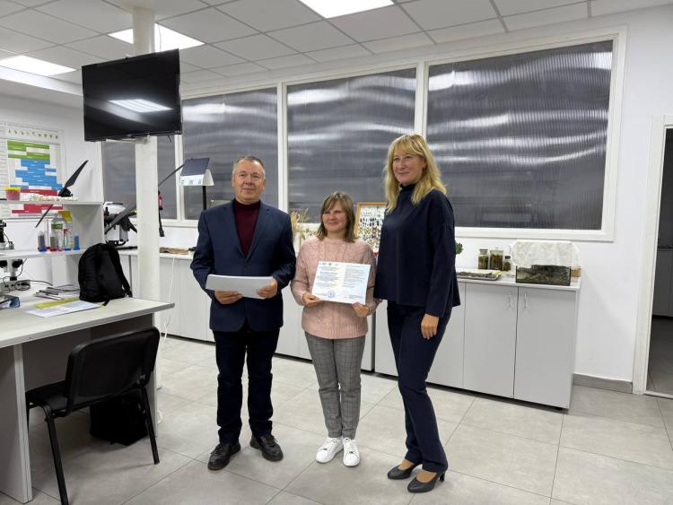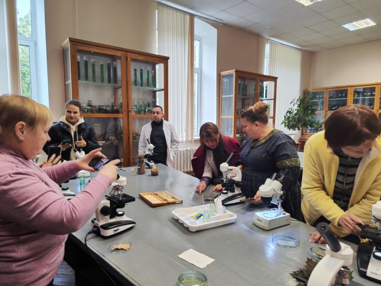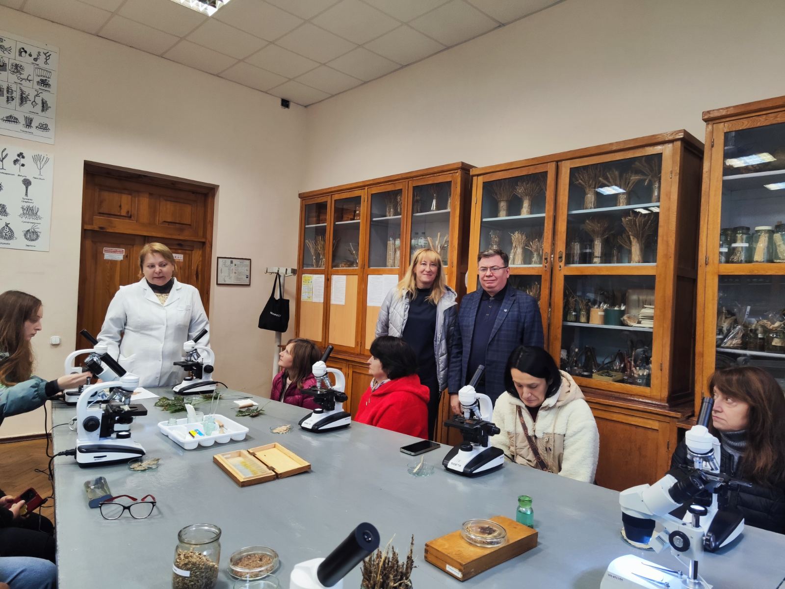 В сучасній навчально-науково-виробничій лабораторії «Моніторингу пестицидів у технологіях захисту рослин» пройшла практична робота під назвою «Комахи, як освітній інструмент: методичні та практичні аспекти використання». Під час занять педагоги ознайомилися з сучасними підходами до використання живих об’єктів у навчальному процесі, зокрема з можливостями застосування комах для формування практичних навичок і підвищення інтересу учнів до біології. Учасники отримали методичні рекомендації з утримання та догляду за навчальними об’єктами, а також обговорили шляхи інтеграції таких матеріалів у шкільні програми. В проблемній науково-дослідній лабораторії «Мікології і фітопатології» було розглянуто унаочнені методи викладання фітопатології з акцентом на борошнисту росу, сажкові та іржасті хвороби сільськогосподарських культур. Учасникам представили зразки рослин з ознаками ураження, ілюстративні матеріали та методики діагностики, що дозволяють наочно продемонструвати морфологічні особливості збудників і симптоматику уражень рослин. Обговорювалися також шляхи формування у школярів розуміння біологічної природи цих хвороб, принципів їх поширення та підходів до захисту рослин. Результатом роботи стало напрацювання практичних рекомендацій щодо ефективного використання унаочнених матеріалів для поглиблення знань учнів із фітопатології та розвитку їхнього екологічного мислення.