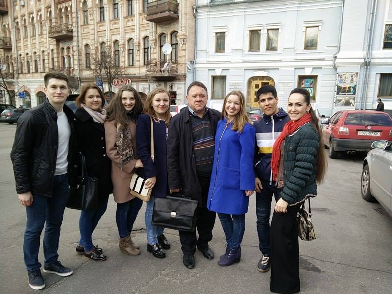 Потім ми направились до Національного драматичного театру ім. І. Франка, де в сквері на лавці завжди сидить народний артист України Микола Яковченко зі своєю улюбленою таксою, а біля входу в театр усіх зустрічає в образі бравого солдата Швейка Гнат Юра – один із засновників, актор і головний режисер театру. І тут нас чекала несподівана зустріч… Ми почули чийсь голосний спів і голос видався нам знайомим. Це був народний артист України Богдан Бенюк. Він якраз приїхав на роботу до театру. Звичайно, ми скористались такою нагодою і сфотографувались разом. Дякуємо панові Богдану за яскраву зустріч!