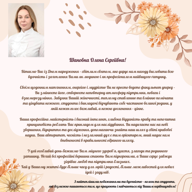 Щиро вітаємо з Днем народження декана юридичного факультету Олену ЯРУ!