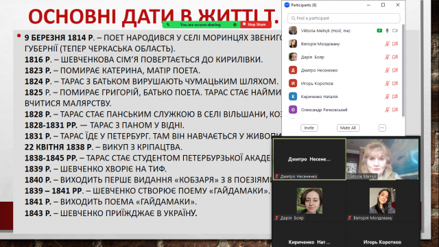 Ми також ознайомилися з матеріалами з історії українського народу, які кожен з нас переглянув у вільний час («Справжній Шевченко: невідоме про українського генія», част. 1 і 2», https://youtu.be/vENptozY22k, https://www.youtube.com/watch?v=m03m_Ii1VfU&t=5s; фільм «Поводир» https://www.youtube.com/watch?v=cdp5yn9P_E4)Таким чином, Тарас Шевченко є справжнім національним поетом, який красномовно виражає визвольні прагнення й волелюбні якості поневоленого українського народу. Минуло багато років після смерті великого Кобзаря, але його творчість завжди була та залишається суспільним надбанням. Можна з упевненістю прогнозувати, що в майбутньому, коли ми побудуємо сильну державу, нетерпиму до свавілля, "сім'ю вольну, нову", ми будемо згадувати Тараса Шевченка з такою ж повагою і любов'ю, як і сьогодні. Бо саме про це він мріяв.