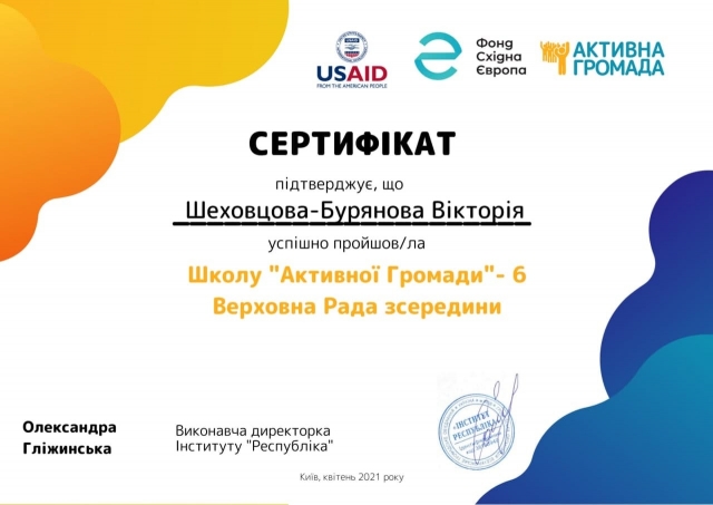 Аспірантка кафедри філософії та міжнародної комунікації Шеховцова- Бурянова Вікторія прослухала курс тренінгів в рамках Школи Активної Громади-6: «Верховна Рада зсередини», який відбувся з 26 по 29 квітня 2021 року.