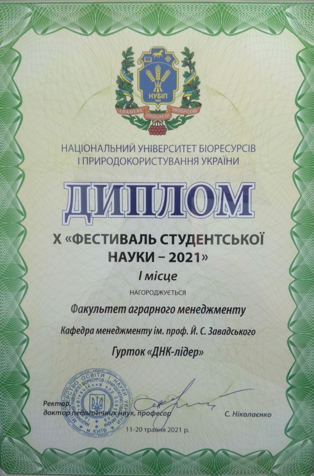 За підсумками Х-го «Фестивалю студентської науки – 2021» гурток «ДНК лідера» кафедри менеджменту ім. проф. Й.С. Завадського отримав перемогу серед більше 100 студентських наукових гуртків, які функціонують в НУБіП України.