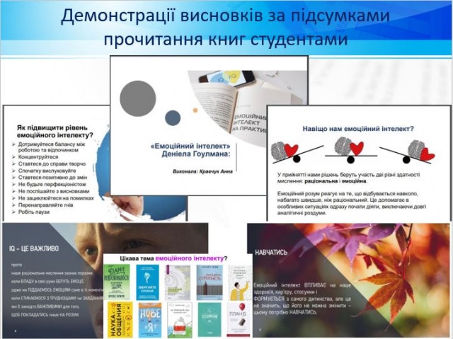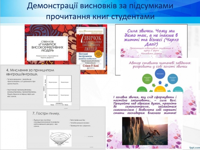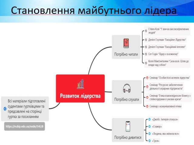 Також студенти за ці два роки підготували ілюстровані презентації та анотовані висновки за підсумками прочитання книг-бестселерів з питань лідерства, саморозвитку та професійного навчання. Кращі роботи студентів оформлені у вигляді імпровізованої виставки на сторінці наукового гуртка, і тепер з ними може ознайомитись кожен бажаючий. Крім книг гуртківці допомагають всім охочим розвинути свій лідерський потенціал, запропонувавши перелік аудіо та відео-матеріалів, частина з яких є їх власним продуктом.