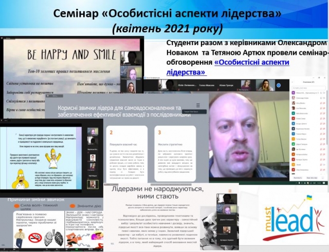Так, під час вивчення дисципліни «Лідерство» два роки поспіль (і в 2020-му, і в 2021-ому роках) студенти випускних курсівбакалаврату спеціальностей «Менеджмент» і «Маркетинг» після перегляду тематичних навчальних відео та опрацювання науково-популярної літератури, додатково організовували семінари на тему: «Особистісні аспекти лідерства». Занурившись у вивчення якогось окремого питання, відібравши головне та сформулювавши його в сконцентровану думку, кожен учасник цього семінару під час свого виступу надавав можливість своїм колегам теж ознайомитись з цією важливою інформацією. Публічне обговорення визначених проблем сприяє осмисленню та засвоєнню почутого матеріалу.