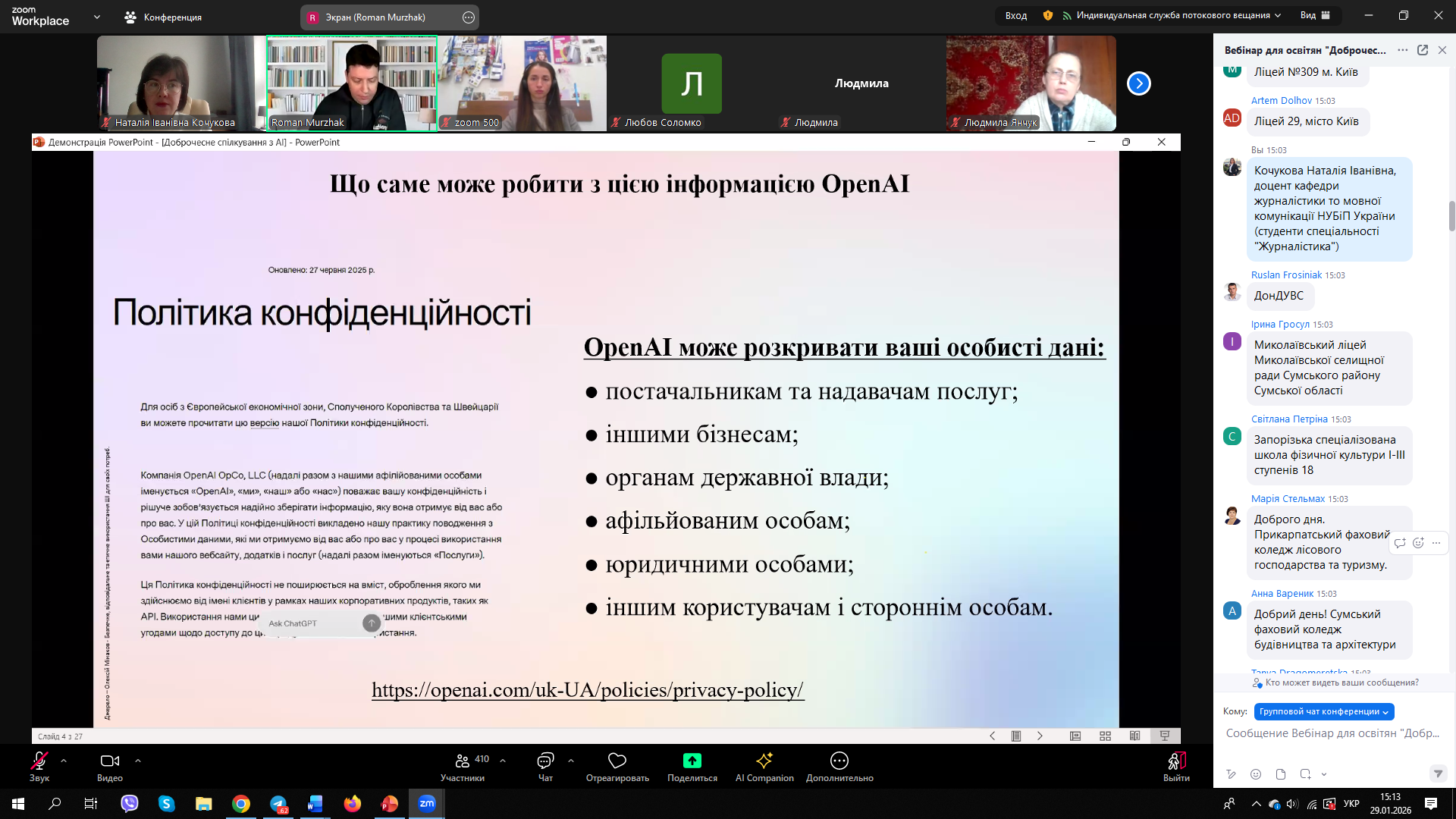 Під час онлайн-зустрічі учасники дізналися про основні принципи доброчесного та етичного використання штучного інтелекту, обговорили, які дані можуть збирати АІ-чат-боти (на прикладі OpenAI), а також зʼясували, якою інформацією не варто ділитися з AI-сервісами. Також учасники отримали практичні рекомендації щодо безпечної роботи з генеративними сервісами.
